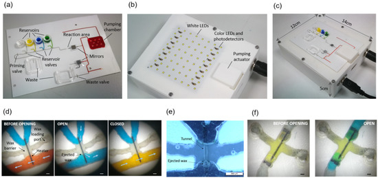 (a) Chip; (b) Instrument; (c) Chip on the instrument; (d) Optical microscope images before and after opening and closing a reservoir valve. Arrows indicate the direction of the flow (a white piece of paper was interposed between the valve and the LED during image captures for improved visualization). Scale bars are 200 µm; (e) Black field optical microscope image of an open reservoir valve. The liquid has been removed to enhance the visualization of the tunnel. Scale bars are 500 µm; (f) Priming valve before and after opening (the LED outline can be seen underneath the valve through the transparent polyester films). Scale bars are 200 µm.