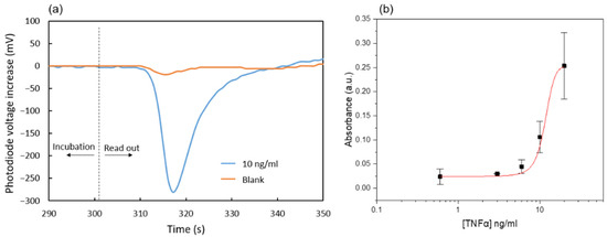 (a) Photodiode signals for two TNFα concentrations; (b) Absorbance response to different TNFα concentrations. Each data point is the average of three measurements obtained from three separate chips. The mean absorbance value of the blanks has been subtracted from the absorbance values obtained for all other TNFα concentrations.