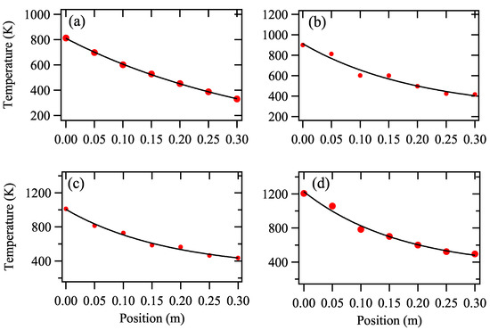 Dependent behavior of nanoclsuters temperature (T) and the position of the probe to the target (x) measure under = (a) 400 W, (b) 600 W, (c) 800 W and (d) 1100 W. Repetition rate f = 60 Hz. The red dots and the black line represent experimental data and fitting curve, respectively.