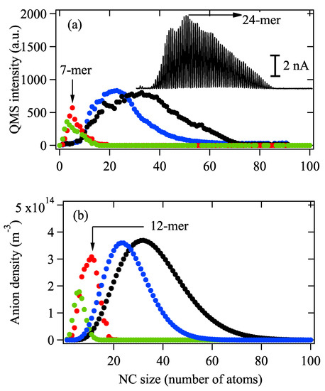 Figure 3a shows the mass spectra of Ag anions obtained under varied from 400 W to 1100 W under the setting of , which means no fragmentation mechanism of NCs is considered at this stage. It should be mentioned that a Matlab program is utilized to pick up all peaks in the original mass spectrum. It can be clearly seen that the maximum intensity reaches around 5 nA, and as increases from 400 W to 600 W, the size distribution of the spectrum shifts to a larger-sized region, indicating the formation of larger-sized NCs. However, as further increases to 800 W and 1100 W, the smaller-sized NCs become more abundant, and the total intensity of the spectra is dramatically reduced. These observations are generally consistent with the results obtained by the model, as shown in Figure 3b. However, a close look at Figure 3a,b at W (red color) indicates that the the size of the most abundant size slightly shifts from 12 to 7-mer, as shown in Figure 3a,b. The observation shown in Figure 3 suggests that although the recombination of anion–cation species at moderate W is the dominant reason for the size shifting, fragmentation of larger NC ions may occur when W. From the inset, we can clearly see that the maximum ion current for Ag reaches 5 nA at .