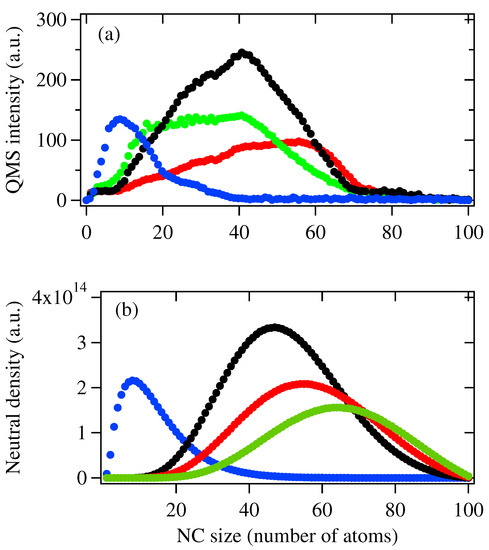 If cluster fragmentation occurs as increases, this mechanism will be more obvious for a neutral cluster because neutral clusters do not undergo cation–anion aggregation, as indicated in Equations (2) and (3). Figure 4 show the mass spectra of neutral species obtained under the same conditions as in the anion case where , i.e., no fragmentation mechanism is considered. When = 400 W and 600 W, we can see the mass spectrum and the size distributions of NCs obtained by Q-MS and the model are generally consistent with each other. As increases up to 800 W, although the size distribution obtained by the Q-MS and the model are similar, the smaller-sized NCs in Figure 4a are clearly more abundant than in Figure 4b. As further increases up to 1100 W, a clear deviation in the size distributions between Figure 4a,b can be observed: for mass spectrum obtained by Q-MS, smaller-sized NCs below 40-mer become more abundant, while in the result obtained by the model, lager sized NCs above 60-mer are still more abundant species. On the other hand, the total intensity for NC neutrals for = 800 W and 1100 W are around 2800 a.u. and 4200 a.u., respectively.