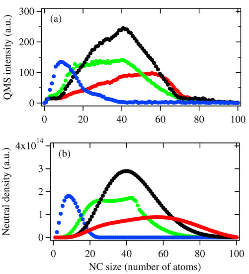 In order to understand the formation mechanism of the NCs prepared by the MPP-MSP source, we have extended the conventional Smoluchowski rate Equation [21] by considering the cation–anion recombination during condensation [22]. The calculation results by extended Smoluchowski rate equations were in good consistence with the mass spectra obtained by Q-MS, indicating that a sequential growth mechanism occurs under low peak power and repetition rate. Furthermore, the extended equation has successfully predicted the formation of large neutral clusters under relatively high (up to 700 W) and f [22]. However, as further increases to higher values, both the size and intensity of ionic NCs are dramatically reduced. According to the extended equation, high leads to denser ionic species, which in turn enhances the cation–anion combination. The behavior that the size of NCs is reduced under high cannot be explained by the extended Smoluchowski model and was proposed to be attributed to the possible fragmentation of large NCs under high plasma temperatures. In order to realize full controllability of relative large NCs, the extended Smulochowski rate equations should be further modified.