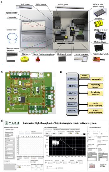 A schematic representation of the proposed AHTEMR platform configuration is described in Figure 2a. These components are: shell, light source, 24 V~220 V power supply, ball screw, stepper motor, motor driver, control circuit, proximity switch, plate bracket, 96-well cell culture plate, collimating lens, flange, spectrometer, and computer. The light source (DH-mini, Ocean Optics, Orlando, FL, USA) is a compact deuterium halide light source with a power output in the UV, visible, and NIR range (200~2500 nm). The miniature spectrometer (USB2000 UV-VIS-ES, Ocean Optics, Orlando, FL, USA) covers the wavelength range from 200 to 850 nm with a resolution of 0.399 nm. Two 74-UV collimating lenses (200~2000 nm) are attached to both incident and outgoing edges of the sample for collimation. To achieve precise two-dimensional motion in the x and y directions of the mechanical system, ball screws are used in conjunction with linear guides and slides. Both sides of the ball screws are attached to the base bearings, and one side is connected to the motor shaft with a coupling to form a one-way motion system. Two-wire track rails with strokes of 100 mm and 200 mm are combined to form a displacement system on the xy plane, which is connected to the custom-designed housing by screws. An optical path holder fabricated by welding and milling has been designed to replace the traditional cuvette holder. A flange connects the collimator and the holder for easy replacement and maintenance. The holder is designed and milled to fit the dimensions of the microplate to form a clear light path. One side of the holder is screwed to the top of the motion platform. The housing and the individual parts are painted in matt black color to minimize the interference caused by reflections.
