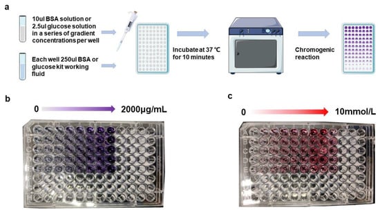 Experimental process of the AHTEMR: (a) Flow chart of the BSA color reaction experiment. (b) Microplate carrying BSA solution after color development. (c) Microplate carrying glucose solution after color development.