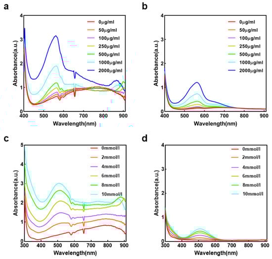 Spectral measurement using the AHTEMR and CMR: (a) Absorbance spectrum of BSA at different concentrations measured by the AHTEMR. (b) Absorbance spectrum of BSA at different concentrations measured by the CMR. (c) Absorbance spectrum of glucose at different concentrations measured by the AHTEMR. (d) Absorbance spectrum of glucose at different concentrations measured by the CMR.