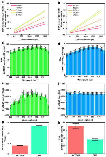 The capacity of the AHTEMR platform for quantifying biochemical compounds at a fixed wavelength was studied by comparing absorbance responses of the AHTEMR platform and CMR to BSA at different spectral wavelengths. The linear fittings of absorbances at different spectral wavelengths for the BSA measured by the AHTEMR platform and CMR are shown in Figure 5a,b, respectively. The absorbances at different spectral wavelengths increase with the concentrations of BSA when measured by both the AHTEMR platform and CMR. The AHTEMR platform and CMR measurements have a similar trend in response to the change in BSA concentration but they show different slopes for the linear fittings, implying that the AHTEMR platform and CMR measurements have different sensitivities at different wavelengths. To find the optimal wavelength of the measurement with the highest sensitivity, we calculated the slopes of the linear fittings of the BSA measurements at different spectral wavelengths. The sensitivity distributions of the linear fittings obtained from the AHTEMR platform and CMR measurements are shown in Figure 5c,d, respectively. The sensitivities of the AHTEMR and CMR are similar in distributions and the maximum sensitivities are both around 562 nm. The wavelength with the maximum sensitivity is consistent with the recommended wavelength for the BSA measurement in the instruction. We also find that the sensitivity of AHTEMR is much larger than that of the CMR and the maximal sensitivity of the AHTEMR at around 562 nm is about 2.38 times the maximal sensitivity of the CMR. This demonstrates that the AHTEMR platform has a better performance in sensitivity when compared to the CMR.