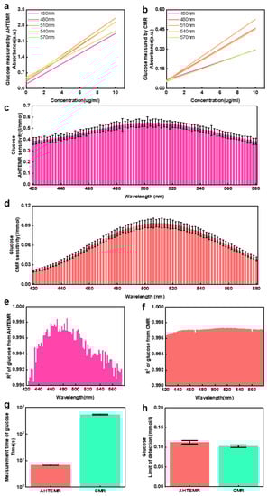 We calculated the R-squared values of linear fittings of the glucose measurement at different spectral wavelengths to evaluate the linearity of responses of the AHTEMR and the CMR to the change in glucose concentration at different wavelengths. The sensitivity distributions of the linear fittings measured by the AHTEMR platform and CMR are shown in Figure 6e,f, respectively. The R-squared values calculated from the AHTEMR and CMR measurement show different distributions. The distribution from the AHTEMR platform has a high R-squared value around 0.997 with wavelengths ranging from 460 to 520 nm and a low R-squared value around 0.994 with wavelengths ranging from 520 to 580 nm. In contrast, the distribution of the CMR is flat and stays around 0.996 with wavelengths ranging from 420 to 580 nm. Therefore, the linearity of absorbance response of the AHTEMR platform in glucose measurement is worse than that of the CMR in wavelengths ranging from 520 to 580 nm, but it is better than that of the CMR in wavelength ranging from 460 to 520 nm. Given both the AHTEMR platform and CMR showed maximum sensitivity around 505 nm, and may work at a wavelength of 505 nm in practical application, the linearity of absorbance response of the AHTEMR platform could be better than that of the CMR.