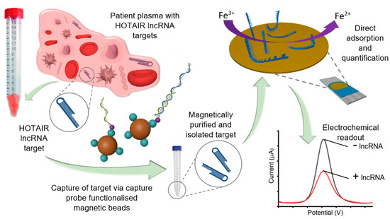 To further improve assay sensitivity, biosensors often utilize the unique multifunctional properties of nanomaterials to facilitate HOTAIR lncRNA target purification by featuring a high surface area and porosity, excellent biocompatibility and magnetic properties [25]. These properties of nanoparticles may serve as anchoring sites for biorecognition components such as antibodies, enzymes, single-stranded RNA (ssRNA) or single-stranded DNA DNA (ssDNA) [25]. These biorecognition components allow the HOTAIR lncRNA targets to be magnetically captured, purified, and isolated before being brought directly to the sensor surface, greatly reducing the availability of non-HOTAIR targets that would otherwise cause biofouling at the sensor surface. This biosensing strategy/miniaturization platform offers rapid detection and low-cost analysis, eliminating the need for amplification, target labelling, and sensor surface functionalization [26].