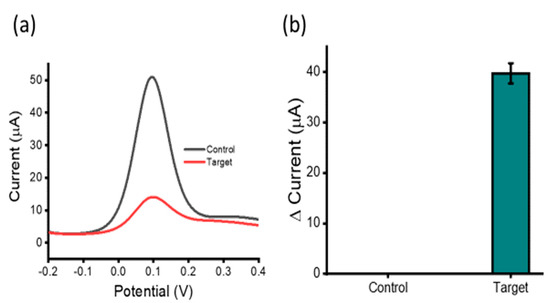 Figure 1 illustrates the assay principle of HOTAIR lncRNA detection. HOTAIR lncRNA extracted from plasma samples was magnetically captured, purified, and isolated via heat denature, for direct adsorption onto an SPE-Au. Subsequent electrochemical detection was performed using voltametric interrogation with the [Fe(CN)6]3−/4− redox couple for DPV readout and quantification. Briefly, biotinylated capture probe sequences (complementary to HOTAIR lncRNA targets) bound to streptavidin-coated magnetic beads were allowed to hybridize with HOTAIR lncRNA targets in solution via the biotin–avidin interaction. Captured HOTAIR lncRNA targets were then magnetically purified through several washing steps, allowing the removal of non-targets from the solution, leaving behind the nanoparticle/capture probe/HOTAIR target complexes. A heat release step was performed to denature the HOTAIR targets from the capture probe/nanoparticle complexes, for removal from the solution. Released HOTAIR targets were then directly adsorbed on the bare, unmodified metal interface via the gold-RNA affinity interaction for subsequent electrochemical detection. To evaluate the assay functionality, we investigated our assay in the presence and absence of 100 nM synthetic HOTAIR lncRNA (Figure 2a). Previous reports have demonstrated that [Fe(CN)6]3−/4− redox system alone can be utilized to quantify surface bound nucleic acids on a gold surface [27,28]. Electrochemical detection yielded almost four-fold reduced current response in comparison to the control, which demonstrates the functionality of our assay (Figure 2b). When adsorbed on the gold sensor surface via the RNA–gold affinity interaction, the negative charges experience coulombic repulsion between ferricyanide ions. This repulsion results in a decreased faradaic current signal (for the one-electron transfer reaction) compared to the control [13].
