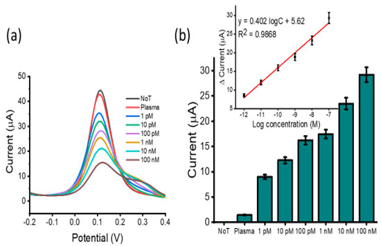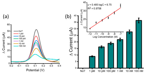 Assay testing in spiked plasma samples: (a) DPV readout displaying current output for serially diluted HOTAIR lncRNA in spiked plasma from 1 pM to 100 nM in reference to the NoT and (b) change in DPV current response for serially diluted HOTAIR targets in response to the NoT with linear calibration plots (inset). Error bars represent the standard deviation across three separate experiments.