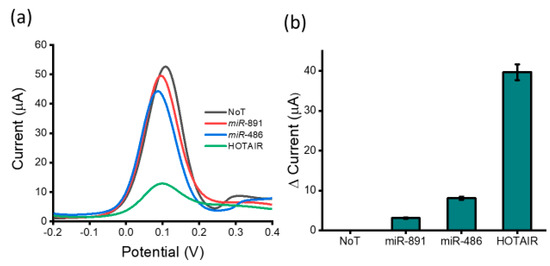 Assay specificity: (a) DPV readout displaying current output after the assay was tested with various miRNA sequences (miR-891 and miR-486 (100 nM), NoT and target HOTAIR lncRNA (100 nM)) and (b) relative current change of miRNA sequences and target HOTAIR lncRNA with respect to the NoT. Error bars represent the standard deviation across three separate experiments.