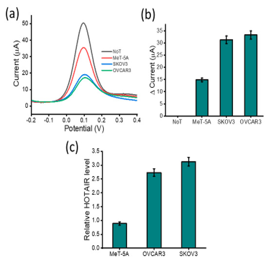 Assay cell line testing: (a) DPV readout displaying current output for benign (MeT-5A), carcinoma (OVCAR-3 and SKOV-3) in comparison to NoT and (b) change in DPV current response of the three cell lines in reference to the NoT. Error bars represent the standard deviation across three separate experiments. (c) RT-qPCR showing the relative HOTAIR expression levels in ovarian cancer cell line (SKOV3 and OVCAR3) and non-cancerous MeT-5A.