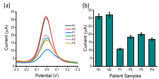 In addition to complex biological media testing with cell line samples, the practical feasibility of the proposed lncRNA biosensor for clinical application was investigated by detecting lncRNAs levels in extracted total RNA from four ovarian cancer high-grade serous sub-types (P1, P2, P3 and P4) and two benign samples (N1 and N2) (Figure 7). With the starting total RNA concentration of 10 ng µL−1, the DPV signals from the ovarian carcinoma samples were distinct from the benign samples showing high expression of the lncRNAs. The overexpression of HOTAIR lncRNA in ovarian cancer patients noted in the study is in agreement with previous reports which noted the association of HOTAIR expression levels with lymph node metastasis and a poor prognosis of patients with epithelial ovarian cancer [39]. The clinical data showed good inter-assay reproducibility as evidenced by the %RSD = 6%, (for n = 3). Thus, the established interfacial biosensing approach might become a potential tool for lncRNA assay in real samples.