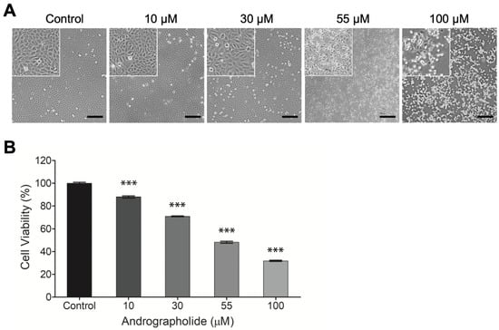 (A) Typical phase-contrast images of OEC-M1 cells cultured in 24-well cell culture plates 24 h after exposure to different concentrations (0, 10, 30, 55, and 100 μM) of andrographolide. Cell number decreases as compound concentration increases. Cells exhibit a perceptibly distressed and shrunken morphology 24 h after exposure to 100 μM of andrographolide. Images inside the top left small boxes are shown in 5x magnification. Scale bar = 200 µm. (B) Change in cell viability of OEC-M1 cells after treatment with andrographolide for 24 h at the indicated concentrations. Cell viability was evaluated by the alamarBlue assay. All treatments at higher concentrations significantly reduced cell viability relative to the control groups. Five independent experiments were performed (n = 5), and the results are shown as means ± SEM. *** p < 0.001.