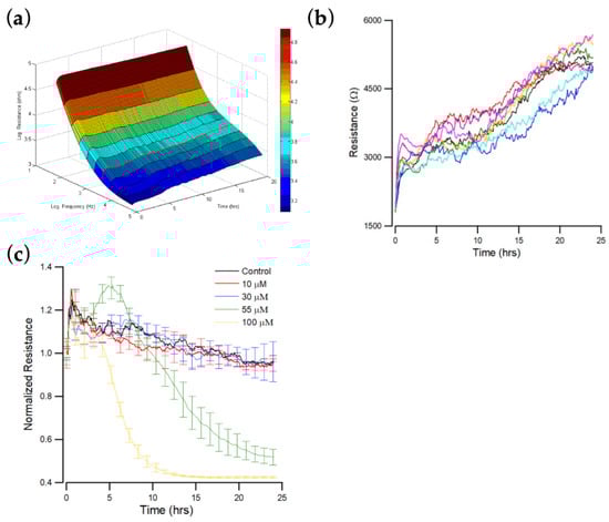 Figure 2b shows the resistance data measured at 4 kHz as a function of time, where 4 kHz is the optimal detection frequency for assessing OEC-M1. When cells attach and spread on the sensing electrode, their membranes interfere with the space directly above the electrode that is available for current flow. OEC-M1 grows as a confluent monolayer, so the cell-covered electrode’s measured resistance is relatively high at approximately 5–6 kΩ at 4 kHz. When the cells fully spread, the measured impedance fluctuates because the cells are in constant motion, so current flow changes. The final average impedance values and the fluctuations are characteristic of this cell type.