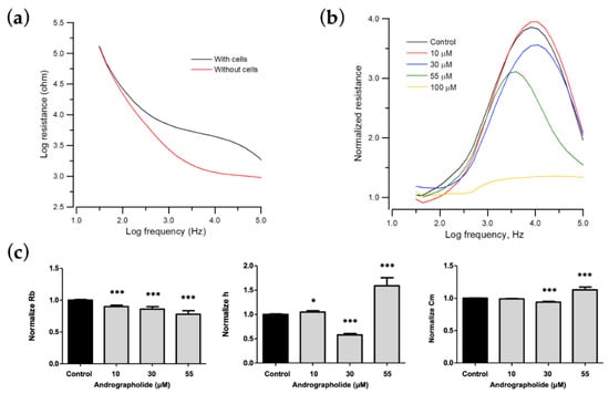 Change in morphological parameters of confluent OEC-M1 cells layers after challenge with different concentrations of andrographolide. (a) Resistance data as a function of frequency for cell-free (red line) and cell-covered (black line) electrodes. (b) Normalized resistance curves as a function of frequency using a frequency-scan measurement 24 h after the addition of andrographolide to confluent OEC-M1 cell layers at concentrations of 10 μM (red), 30 μM (blue), 55 μM (green), 100 μM (yellow), and control (black). (c) Changes in normalized junction resistance between cells, average cell–substrate separation, and membrane capacitance of confluent OEC-M1 cell layers after challenge with different concentrations of andrographolide. Six independent frequency scan experiments were performed (n = 6). Two or three wells were measured for each drug concentration for each experiment. Values are shown as means ± SEM. * p < 0.05, *** p < 0.001. Each value is expressed as a percentage of the control.