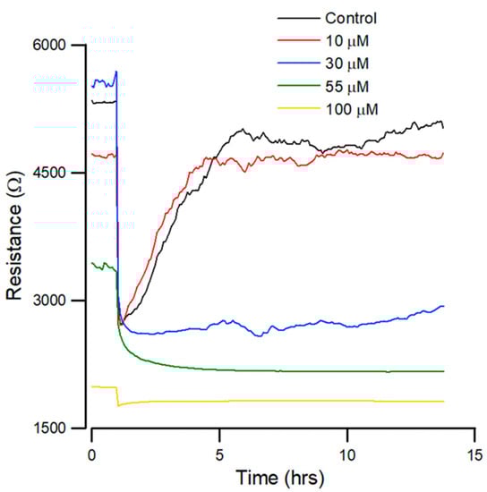 The resistance was measured at 4 kHz for 14 h after wounding. Figure 4 shows that the cells are electrically wounded at t = 0.5 h, and data acquisition was briefly suspended for 6 min. The resistance values decrease to about 1.5–3 kΩ post-wounding, indicating cell death and detachment from microelectrodes. Data acquisition was then restarted at t = 0.6 h.