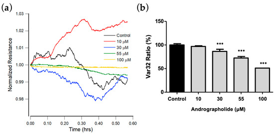 Figure 5a shows the plot for resistance data normalized to the value at the start of each run. The results show that the micro-motion of OEC-M1 is significantly inhibited at a concentration of andrographolide of more than 55 μM. Figure 5b shows the Var32 values for these time-series data. There is a significant dose-dependent decrease for an andrographolide concentration of 30 μM and higher.