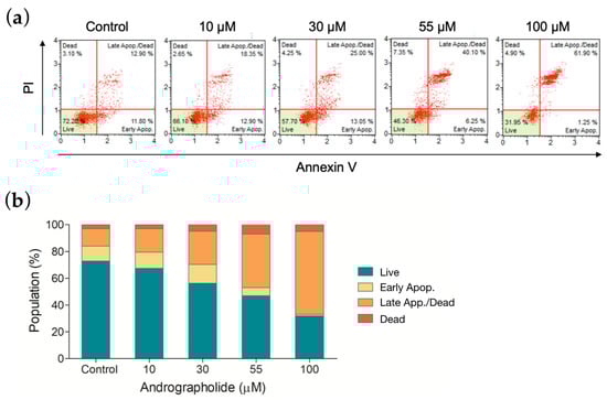 To determine the ability of the different treatments to induce apoptosis against OEC-M1 cells, cells were plated in 24-well plates at a density of 5 × 104 cells per well. After 24 h of incubation, cells were incubated with initial concentrations of andrographolide of 10, 30, 55, and 100 µM for 24 h. After 24 h, the cells were washed with PBS, trypsinized, and centrifuged at 1200 rpm for 10 min. After centrifugation, 1 × 105 cells were stained according to the manufacturer’s instructions and analyzed using a Guava EasyCyte Plus Flow Cytometer (Millipore, Billerica, MA, USA). The degree of apoptosis is quantified in terms of the percentage of annexin V-positive cells.