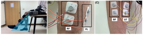 While the semitendinosus was assumed to have the same activation as the semimembranosus [36], the semitendinosus muscle group (ST) included the semitendinosus and the semimembranosus. In this study, four pairs of surface EMG electrodes were positioned at skin locations above the muscles of RF, VM, BF, and ST as shown in Figure 2B,C, which were used to measure the EMG activity during flexion–extension movements of knee. The study was reviewed and approved by the Taipei Veterans General Hospital Institutional Review Board (IRB2020-10-001). All recoded EMG data are made available at the repository (https://doi.org/10.5281/zenodo.6516777), assessed on 29 April 2022.
