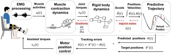 To tackle the challenges described above, we introduced the method of differentiable systems [32] applied to spring-damper models in 2D and 3D, which also was used for adjoint optimization on 3D rigid body engines [33], and the integration of articulated body dynamics into deep-learning frameworks and gradient-based optimization of neural networks that operated on articulated bodies [34]. Our proposed model was tested with healthy people for control of the knee exoskeleton in flexion–extension movements, which merged a differentiable continuous system with a dynamic musculoskeletal model to support an effective and accurate performance for an exoskeleton controlled by EMG signals.