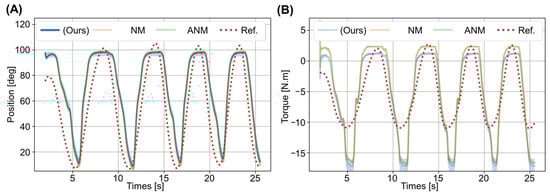In comparison, the step of inverse dynamics transformation is eliminated in our model, and calculating the torque only requires the measured angle for parameter estimation. According to the results in Figure 6, the torque derived from the predicted trajectory through the inverse equation of motion afterwards was similar to the torque expected from the reference trajectory. This means that our training framework can implicitly and automatically estimate the torque during motion.