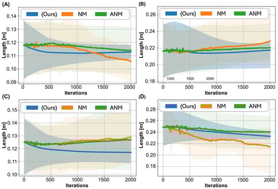 Convergence analysis of the identified muscle parameters. (A) Optimal muscle fiber length in VM. (B) Optimal muscle fiber length in ST. (C) Tendon slack length of VM. (D) Tendon slack length of ST.