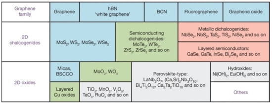 - Novoselov, K.S.; Jiang, D.; Schedin, F.; Booth, T.J.; Khotkevich, V.V.; Morozov, S.V.; Geim, A.K. Two-dimensional atomic crystals. Proc. Natl. Acad. Sci. USA 2005, 102, 10451–10453. [Google Scholar] [CrossRef] [Green Version]