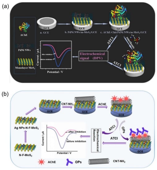 - Song, D.D.; Li, Q.; Lu, X.; Li, Y.S.; Li, Y.; Wang, Y.Z.; Gao, F.M. Ultra-thin bimetallic alloy nanowires with porous architecture/monolayer MoS2 nanosheet as a highly sensitive platform for the electrochemical assay of hazardous omethoate pollutant. J. Hazard. Mater. 2018, 357, 466–474. [Google Scholar] [CrossRef]
