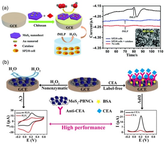 - Wang, T.Y.; Zhu, H.C.; Zhuo, J.Q.; Zhu, Z.W.; Papakonstantinou, P.; Lubarsky, G.; Lin, J.; Li, M.X. Biosensor Based on Ultrasmall MoS2 Nanoparticles for Electrochemical Detection of H2O2 Released by Cells at the Nanomolar Level. Anal. Chem. 2013, 85, 10289–10295. [Google Scholar] [CrossRef] [PubMed]