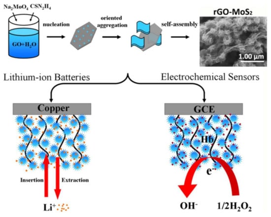 - Liu, H.; Chen, X.J.; Su, X.; Duan, C.Y.; Guo, K.; Zhu, Z.F. Flower-like MoS2 Modified Reduced Graphene Oxide Nanocomposite: Synthesis and Application for Lithium-Ion Batteries and Mediator-Free Biosensor. J. Electrochem. Soc. 2015, 162, B312–B318. [Google Scholar] [CrossRef]
