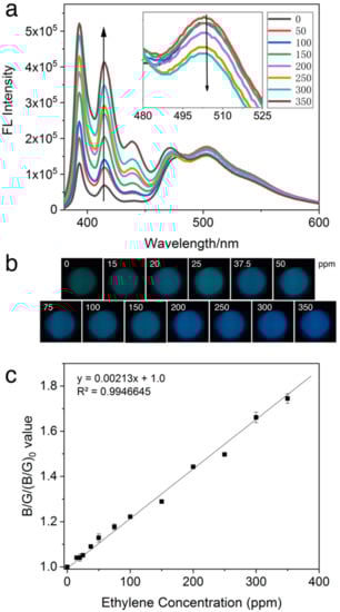 Investigating the root cause of this shift, it was noted from the fluorescent emission spectra in Figure 4a that the intensity in the green region (peak at 503 nm) decreased gradually while intensity in the blue region (peak at 393 nm and shoulder at 415 nm) increased. The ratio between RGB values has been used to better describe the observation made in colorimetric assays [36]. The relationship between (B/G)/(B/G)0 values and concentration of ethylene was explored, as illustrated in Figure 4c. The (B/G)/(B/G)0 value of solution was shown to be linear from 0 to 350 ppm with an R2 value of 0.9947. These values depict a large linearity range with a good linear relationship with different concentrations of ethylene. The large range of linearity may be based on two reasons: first, our probe has a good sensitivity to even very low ethylene concentrations; and the second, silica optical fiber was applied to reduce the loss of optical signals during transmission.