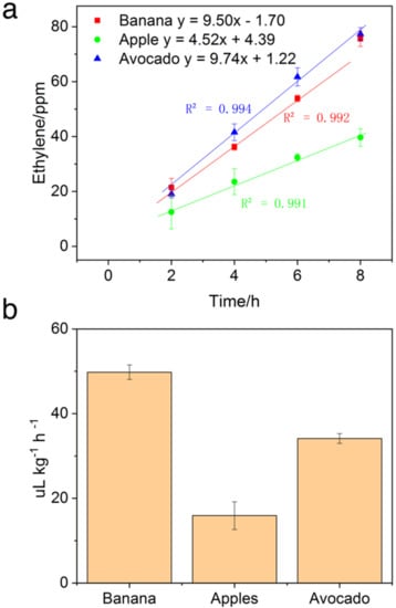 Detection of Ethylene Released during Fruit Ripening. During ripening, climacteric fruits display increased respiration and ethylene biosynthesis rates. Monitoring the ethylene release could provide insights into the maturity index of fruit. It worth considering that retail samples of fruits generally undergo an exogenous application of ethylene for better color and eating quality. However, poor control of ethylene could result in reduced shelf-life of fruits due to increased respiration rates. SOFS coupled with PYG provides the avenue to bring down the cost of rapid and onsite testing of ethylene. This could provide convenient testing to ensure quality control on both the wholesale and the retail levels. To test for this practical applicability, three climacteric fruits’ ethylene production during ripening was characterized. The ethylene releasing rates were calculated from ethylene concentrations monitored over time. The ethylene response curve of fruits over time is shown in Figure 6a and ethylene release rates shown in Figure 6b. The ethylene release rates of fruit calculated with Equation (2) above ranged from 17 to 46 μL kg−1 h−1. The banana displayed the highest rate of ethylene release out of the three tested, followed by avocados then apples. A higher ethylene release rate, based on the species, could be indicative of riper fruit. Fruits measured were also found to show a linear increase in ethylene concentration with increasing storage time. This displays the steady state biosynthesis and release of ethylene during storage.