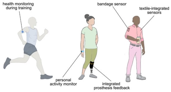 Wearable sensor past, current, and future. Early sensors focused on monitoring training of military personnel and athletes. Current personal electronics boom integrates activity and health monitoring into existing electronics (smart phones, watches, prosthetics). Future wearable devices aim to seamlessly integrate into our daily life for continuous feedback on our health. (This image was created using BioRender, Office, and Adobe products.).