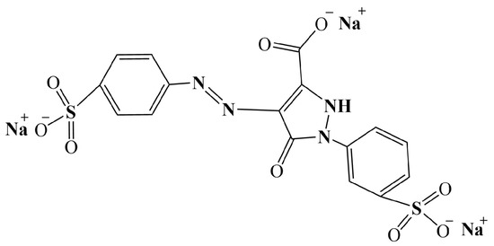 Tartrazine (TZ, Figure 1) is an artificially synthesized azo pigment that has been widely used as a colorant in drinks, foods, cosmetics, and pharmaceuticals to make them more attractive. However, TZ shows genotoxicity towards DNA, hemoglobin, and lymphocytes, and neurotoxicity towards memory, learning, thought, and other neurobehavior. TZ can cause symptoms such as diarrhea, allergies, eczema, migraines, dysphoria, and melancholia, and even cancer after long-term excessive ingestion. On account of these risks, the use of TZ is strictly regulated, and the maximum intake of TZ should not exceed 7.5 mg/kg daily [1,2]. It is very important to determine TZ levels in materials to ensure consumer safety. Recently, a diverse range of detection systems for TZ have been developed to overcome the drawbacks of common analytical techniques, such as low sensitivity and anti-interference ability, complex programming, and lengthy analysis time. Among the developed approaches, the electrochemical method exhibits obvious advantages in terms of sensitivity, accuracy, time consumption, convenience, economy, and miniaturization [3].