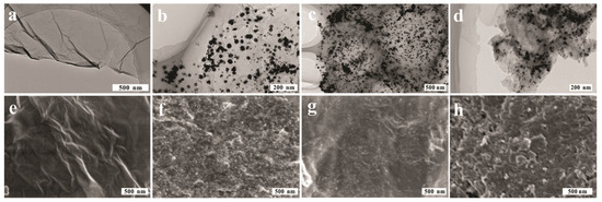 TEM and SEM images of (a,e) GO, (b,f) GO–PtCo, (c,g) GO–PtCo@MIPDA, and (d,h) GO–PtCo@NIPDA.