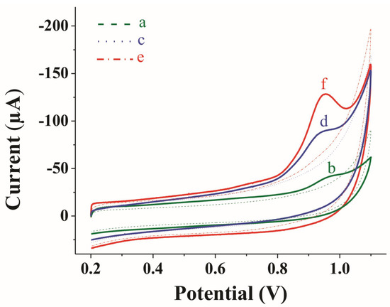 Under alkaline conditions (pH > 7.5), DA is first oxidized by oxygen to DA quinone, followed by 1,4-Michael-type intramolecular cyclization to yield leucodopaminechrome. Leucodopaminechrome undergoes further oxidization and intramolecular rearrangement to form 5,6-dihydroxyindole and its isomer, which subsequently polymerize to give PDA, a melanin-like polymer with a cross-linked structure. PDA obtained by self-polymerization of DA tends to coat diverse substrates as a thin film, especially GO and metallic surfaces. It is generally accepted that the catechol group plays the central role in the mussel-mimicking behavior of PDA [16,17]. The current peaks disappeared after coating NIPDA on the surface of GO, GO–Pt, and GO–PtCo (Figure 4, curves a, c, and e, respectively, and Scheme 1d–f, respectively), meaning that NIPDA showed no electrocatalytic activity towards TZ and prevented the access of TZ to the conductive matrix. After surface coating of GO–Pt and GO–PtCo with MIPDA, the peak strengths for TZ were obviously enhanced over those of GCE/GO-Pt and GCE/GO-PtCo, respectively, which was attributed to the imprinted cavities in MIPDA (Figure 4, curves d and f, respectively; Figure 3, curves d and f, respectively; and Scheme 1h,i, respectively). For GO@MIPDA, the original peak response of GO to TZ disappeared, indicating that the original electroactive sites were used as grafting sites and covered by electrochemically inert PDA (Figure 4, curve b; Figure 3, curve b; and Scheme 1g). Overall, GO–PtCo@MIPDA showed the greatest response to TZ, indicating that it displays the most promise for application as a TZ sensor.