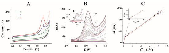 The surface of the GO-modified electrode exhibited a small anodic peak response to TZ, which was not displayed by the bare electrode surface, indicating that there are electrochemically active sites on GO for configuration-suitable molecules within the diffusion layer (Figure 3, curve b, and Scheme 1a). Larger anodic peaks were obtained on the corresponding surfaces of Pt- or PtCo-decorated GO (Figure 3, curves d and f, respectively, and Scheme 1b,c, respectively). These results clearly show that Pt and PtCo provided more active sites for TZ than GO, supporting the idea that incorporating metal nanoparticles is an effective strategy for increasing the electrocatalytic activity of GO [20,21,22,23]. In addition, the presence of Co in the nanoalloy further influenced the electrocatalytic activity of the sensor, which is a result worthy of further research.