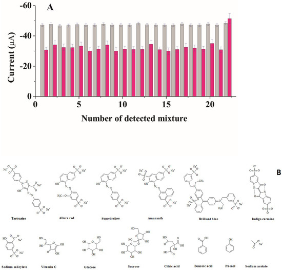 (A) Influence of coexisting substances on the electrochemical response of GCE/GO–PtCo@MIPDA (grey) and GCE/GO–PtCo (pink) to TZ. Solution composition: (1) 3.5 µM TZ in 0.2 M acetate buffer solution (pH = 6.0); (2 to 21) with 0.1 mM of (2) Allura Red, (3) sunset yellow, (4) amaranth, (5) brilliant blue, (6) indigo carmine, (7) sodium salicylate, (8) vitamin C, (9) glucose, (10) sucrose, (11) citric acid, (12) benzoic acid, (13) phenol, (14) sodium acetate, (15) Ca2+, (16) K+, (17) Fe3+, (18) Zn2+, (19) SO42−, (20) NO2−, (21) Cl−, and (22) a mixture of (1) and the other 20 kinds of interferents (50 µM each). (B) Molecular structures of some of the analogs.