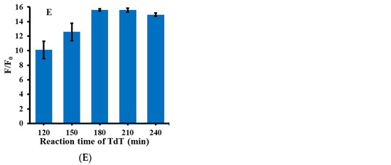 All experimental conditions were optimized, including the concentrations of cDNA, KF polymerase, Nt.BstNBI, TdT, and the reaction time of TdT. The concentration range of cDNA was 20–80 nM. The selected KF polymerase concentration was 50–150 U/mL. The Nt.BstNBI concentration was 20–60 U/mL. The selected concentration of TdT was 70–350 U/mL. The TdT reaction time was 120–240 min. When optimizing the experimental conditions, only one condition was changed at a time, and the other conditions remained unchanged.