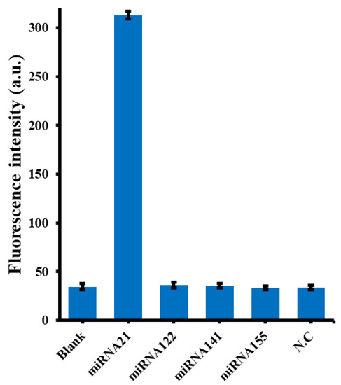 As is mentioned above, practical sampling for miRNA-21 analysis can often be subject to interference from other analogues, especially other micro-RNA [10]. As shown in Figure 4, fluorescence intensity was highest only when miRNA-21 was added, while fluorescence intensity was almost the same as that of the blank control group in the presence of other interfering RNAs. This result also confirmed the selectivity of miRNA-21 in the dual amplificative reaction of the system, as expected, and also confirmed the good specificity of our proposed method for the detection of miRNA-21.