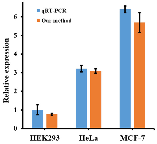 In order to make our conclusions more convincing, miRNA-21 was further tested in different cells’ lyses. Three types of cells (HEK293, HeLa, and MCF-7) were selected to detect miRNA-21 expression levels. According to the literature, the expression of miRNA-21 in these cells MCF-7, HeLa and HeK293 is in descending order, which is representative for intracellular samples [23,38]. The experimental results, shown in the orange bar in Figure 5, were further confirmed by a gradual increase in the expression of miRNA-21 in HEK293, HeLa, and MCF-7 cells. In addition, to verify the sensitivity of miRNA-21 detection, the proposed method was compared with the qRT-PCR results. As shown in the blue bar chart in Figure 5, the relative expression of miRNA-21 detected by our method showed a similar trend to the results detected by qRT-PCR kit, under a certain error allowance. The above two experiments proved that the proposed miRNA-21 detection strategy shows very similar performance compared with the traditional methods, and exhibits good practical application prospects.