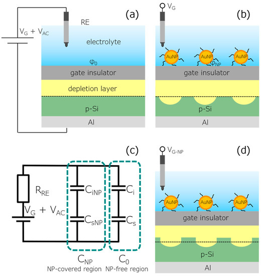 The simplified electrical equivalent circuit of the AuNP-decorated EISCAP is depicted in Figure 1c. The resistances of the electrolyte, bulk Si and Al-Si rear-side contact are typically much smaller than the resistance of the reference electrode (RRE) and are therefore not included in the equivalent circuit. In addition, for typical thicknesses of the gate insulator materials (10–100 nm), measuring frequencies of below 1 kHz and an ionic strength of the electrolyte of >0.1 mM, the double-layer capacitance can also be neglected, see refs. [46,47]. Hence, the equivalent capacitance (Ceq) of the AuNP-modified EISCAP is given by: