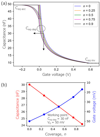 Hence, it is suggested that the recorded change in the ConCap signal is equal to the interfacial potential change. This statement is correct if the entire sensor surface is covered with charged molecules or nano-objects, i.e., when the coverage is n = 1. However, this is often not the case for NP-decorated BioFEDs: usually, due to the inter-particle repulsion and/or immobilization conditions, the sensor surface is only partially covered with charged NPs (i.e., n < 1). As a result, the recorded ConCap signal change will not be equal to the interfacial potential change, which occurs in the NP-covered region. Moreover, it will depend, among others, on the AuNP coverage. The gate voltage (VG-NP) in the ConCap mode, which should be applied to the AuNP-decorated EISCAP to keep the working capacitance (chosen from the depletion region of the C–V curve of the bare EISCAP) constant, can be obtained by using Equation (9) and the condition Ceq-dep = Ceq-dep(n = 0), where Ceq-dep(n = 0) is the equivalent capacitance of the non-modified EISCAP in the depletion region: