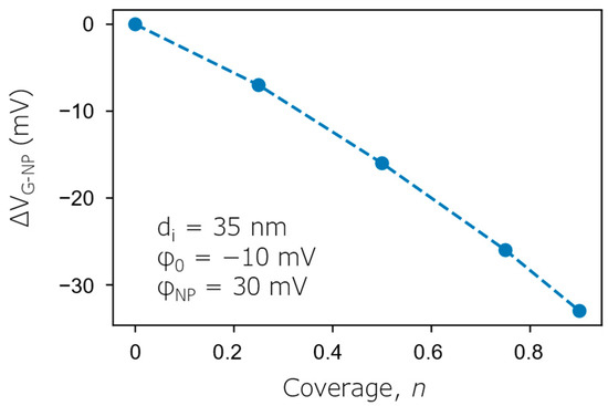 Local changes in the width of the depletion layer in NP-covered and NP-free regions at the gate voltage (VG-NP) applied in the ConCap mode are sketched in Figure 1d. The additional gate voltage (ΔVG-NP = VG-NP − VG) in the ConCap mode (i.e., the ConCap signal change), which is applied to the AuNP-decorated EISCAP to keep the working capacitance constant, was calculated as a function of the AuNP coverage using Equation (15) and is shown in Figure 3. As can be seen, with increasing the AuNP coverage from n = 0.25 to n = 0.9, ΔVG-NP increases from −7 mV to −33 mV. However, the ΔVG-NP values are always smaller than the interfacial potential changes in the AuNP-covered region (Δφ = φNP − φ0 = 40 mV), which is supported by the discussion above.