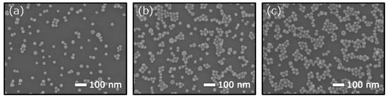 SEM images of the AuNP-decorated EISCAP surface were taken with a high-resolution JSM-7800F Schottky field-emission scanning electron microscope (Jeol GmbH, Freising, Germany). An ImageJ-software macro [52] was utilized to determine the size of decorated AuNPs and to calculate their surface density and coverage from the SEM images (15 images were taken per EISCAP chip). Figure 4 shows representative SEM images of EISCAP surface decorated with AOT-AuNPs with immobilization times of 0.5 h, 1 h and 2 h (from left to right).