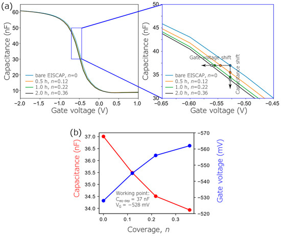 Exemplary C–V curves of the bare and AuNP-decorated EISCAP with different AuNP-immobilization times and therefore, various AuNP coverages are presented in Figure 5. As expected, the decoration of the EISCAP surface with positively charged AOT-AuNPs shifts the original C–V curve of a non-modified EISCAP towards more negative voltages. The reason for this behavior of the C–V curves in case of a p-type EISCAP covered with positively charged AuNPs has been discussed in Section 2. The changes in the overall capacitance of the AuNP-decorated EISCAP (at a constant gate voltage VG = −528 mV) and the amplitude of the voltage shifts (at a constant capacitance of 37 nF) evaluated from the C–V curves are depicted in Figure 5b. As predicted by the capacitive model described in Section 2, the overall capacitance of the EISCAP decreases with increasing AuNP coverage, while the amplitude of the gate-voltage shifts increases. A gate-voltage shift of −34 mV was recorded for the maximum AuNP coverage of n = 0.36, which is achieved in this study.