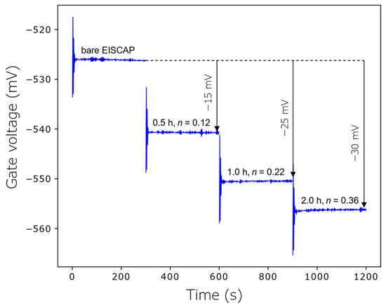The EISCAPs were electrochemically characterized in the C–V and ConCap mode before and after immobilization of the AOTs for 0.5 h, 1 h and 2 h (see Figure 5 and Figure 6).