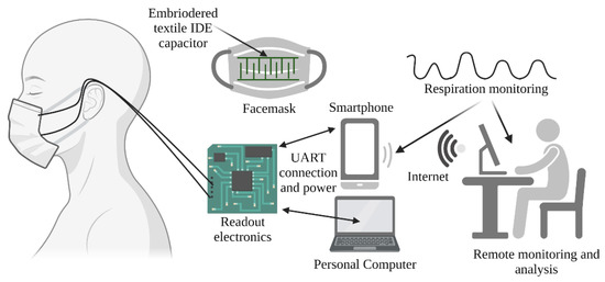 A textile-based capacitor with interdigitated electrodes (IDE) was embroidered onto the inner side of a protective facemask. Capacitor electrodes were connected with copper wires to the readout electronics. To enable the plug and play use of the developed readout electronics with different facemasks, a 3.5 mm connector was used to connect/disconnect wires from readout electronics. Wires were attached to the two capacitor electrodes with rivet buttons. The readout electronic board can be connected through a USB cable to a smartphone or PC, which also acts as the power source for the readout electronics, as well as the unit for data acquisition and display. Furthermore, by using an Internet connection, it was possible to send data to a remote monitoring station. The graphical presentation of the proposed system is given in Figure 1.