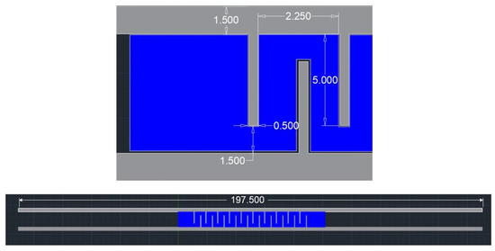 To realize the embroidery of the interdigitated electrode design, the sensor topology was first designed in Autodesk AutoCAD 2021 (Figure 2). As shown in Figure 2, there were 10 fingers per side. The surface area separation from the fingers was 0.2 mm, while the surface area of the hygroscopic layer was 340 mm2. Facemask sensor design parameters were selected to be incorporated into a fold of the face mask, before stretching the mask to cover the whole face. The vector graphic file was subsequently imported in a proprietary stitch digitizing software (BasePac 10, ZSK, Krefeld, Germany) in order to be transformed into the machine code bearing stitch information. The hygroscopic thread was blue, while the conductive thread was silver.